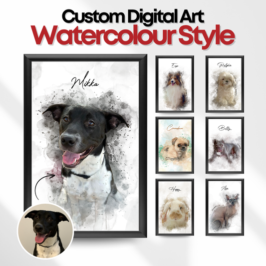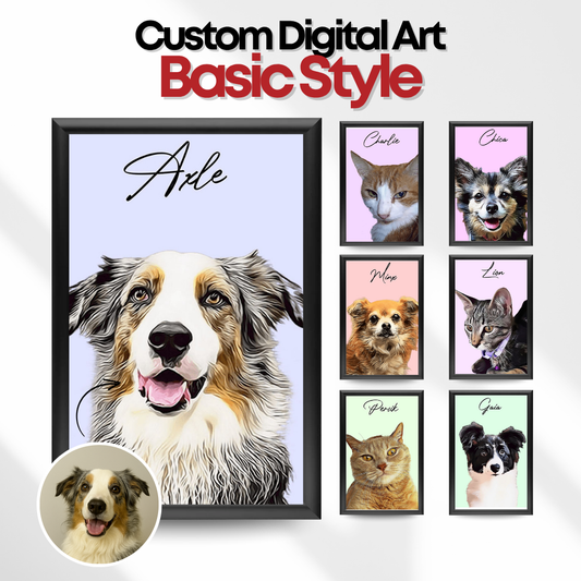 A digital pet portrait is a custom-made digital artwork of your pet, created by an artist using digital tools such as a graphics tablet, and software like Adobe Photoshop or Procreate.